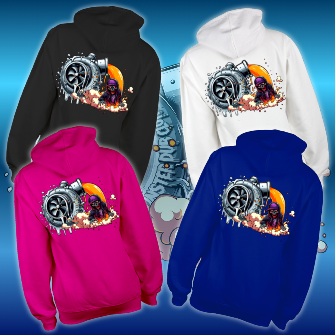 Introducing our eye-catching 'Turbo Melt' design, where art meets automotive flair! This unique piece features a turbocharger that appears to be melting, oozing liquid metal, with a vibrant orange liquid pouring from its outlet, giving it a dynamic sense of motion. Below, a fierce Zombie emerges from a cloud of smoke, adding an edgy twist to this striking visual.
