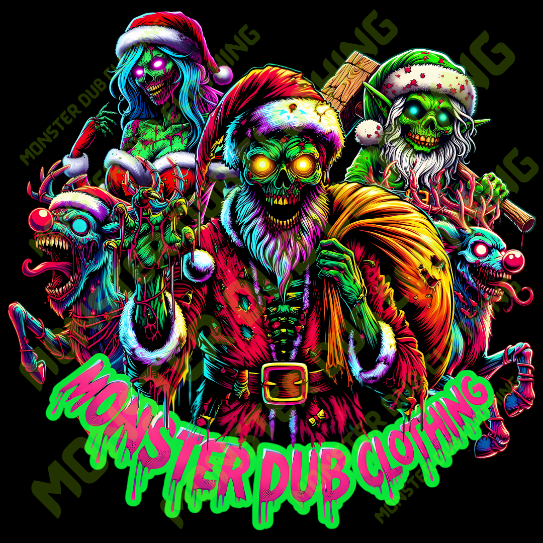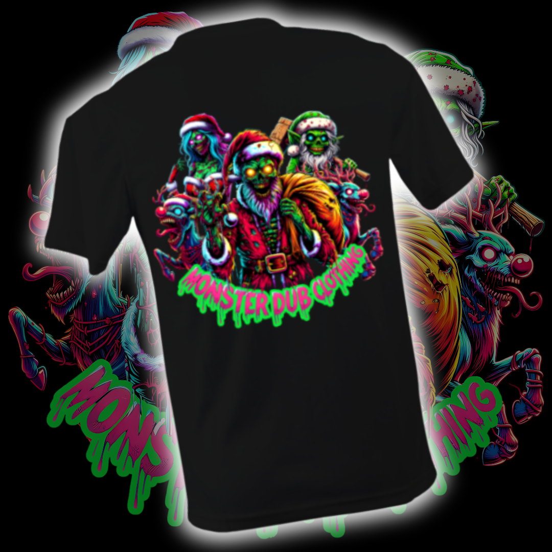 Get ready to unleash your dark side this holiday season with our limited edition Adult Christmas T-Shirt! Featuring a vivid and darkly humorous design, this shirt showcases a zombie-like Santa Claus with glowing yellow eyes, tattered red clothes, and a sinister grin. He s not alone join the eerie crew of a zombie Mrs. Claus, a creepy elf wielding a wooden bat, and monstrous reindeer with sharp teeth and glowing eyes. The bold neon pink and green dripping text MONSTER DUB CLOTHING at the bottom perfectly captures the edgy, streetwear-horror fusion style.