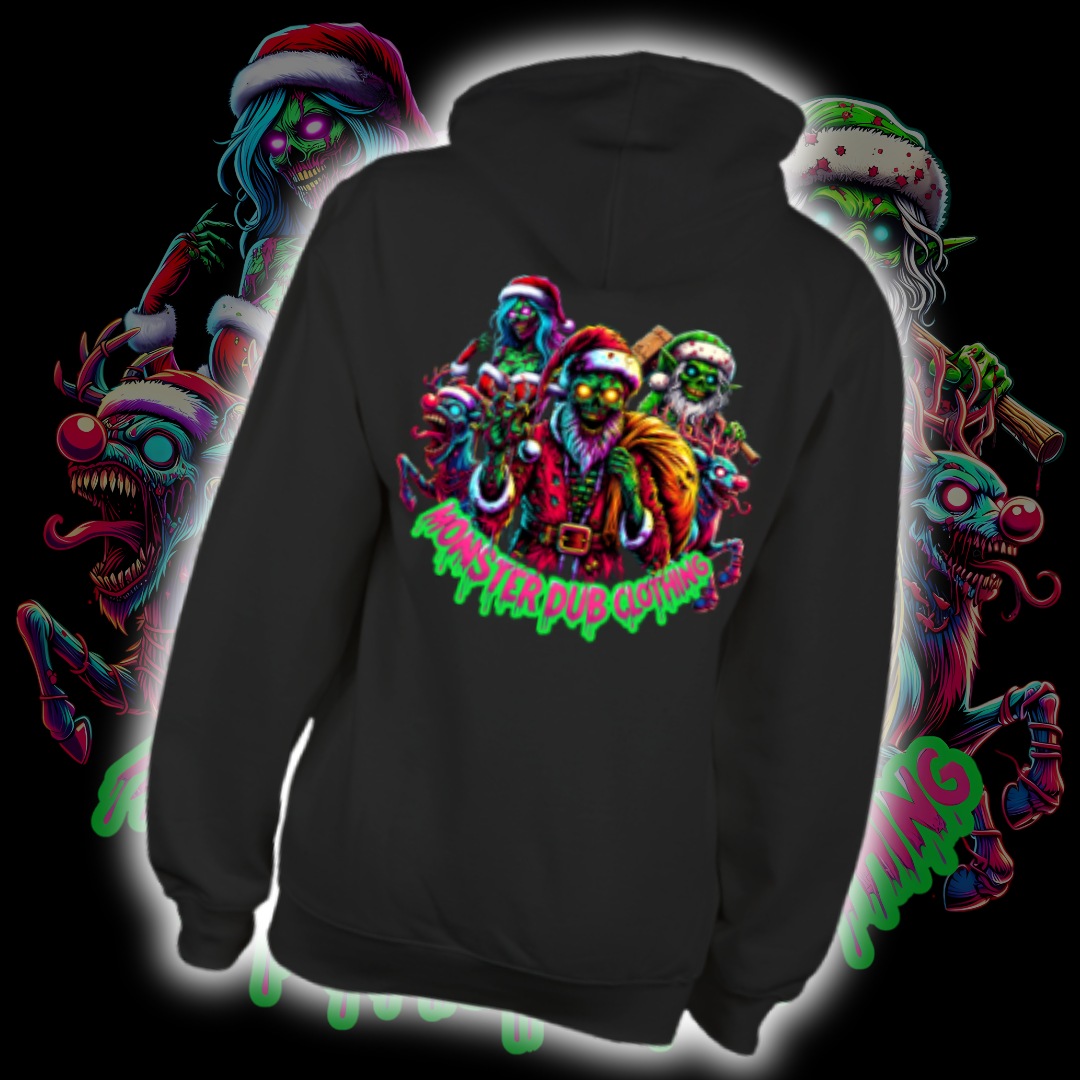 Get ready to unleash your dark side this holiday season with our Adult Christmas Hoodie! Featuring a vivid and darkly humorous design, this hoodie showcases a zombie-like Santa Claus with glowing yellow eyes, tattered red clothes, and a sinister grin. He s not alone join him with a creepy Mrs. Claus, a menacing elf wielding a wooden bat, and monstrous reindeer with sharp teeth and glowing eyes. The artwork is completed with bold neon pink and green dripping text that reads MONSTER DUB CLOTHING, perfectly capturing the edgy, streetwear-horror fusion style.